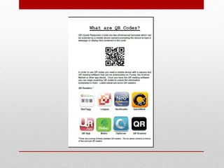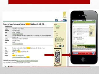 This document discusses adding QR codes to a library catalog at Kentucky State University. It begins by explaining what QR codes are and how they can store more information than conventional barcodes. It then discusses uses of QR codes outside of libraries, such as by companies and New York City for recycling information. The document outlines how the library added QR code features to their catalog by editing XML files to display a QR code linking to holding information and a button to get the information in a QR code. It concludes by discussing additional ways the library uses QR codes in outreach materials.