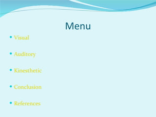 The document discusses three main learning styles: visual, auditory, and kinesthetic. It states that visual learners prefer using images and spatial understanding, auditory learners prefer using sound and music, and kinesthetic learners prefer using their bodies and sense of touch. Examples of aids that help each style are also provided. In conclusion, understanding one's own learning style can help them succeed in school and everyday activities by using aids tailored to that style.