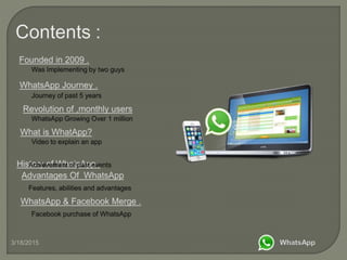 WhatsApp was founded in 2009 by Brian Acton and Jan Koum, who both previously worked at Yahoo for many years. WhatsApp has grown tremendously in the past 5 years from a simple app idea to serving over 400 million users worldwide, adding over 1 million new users per day. In 2014, Facebook acquired WhatsApp for $19 billion to expand their messaging services.