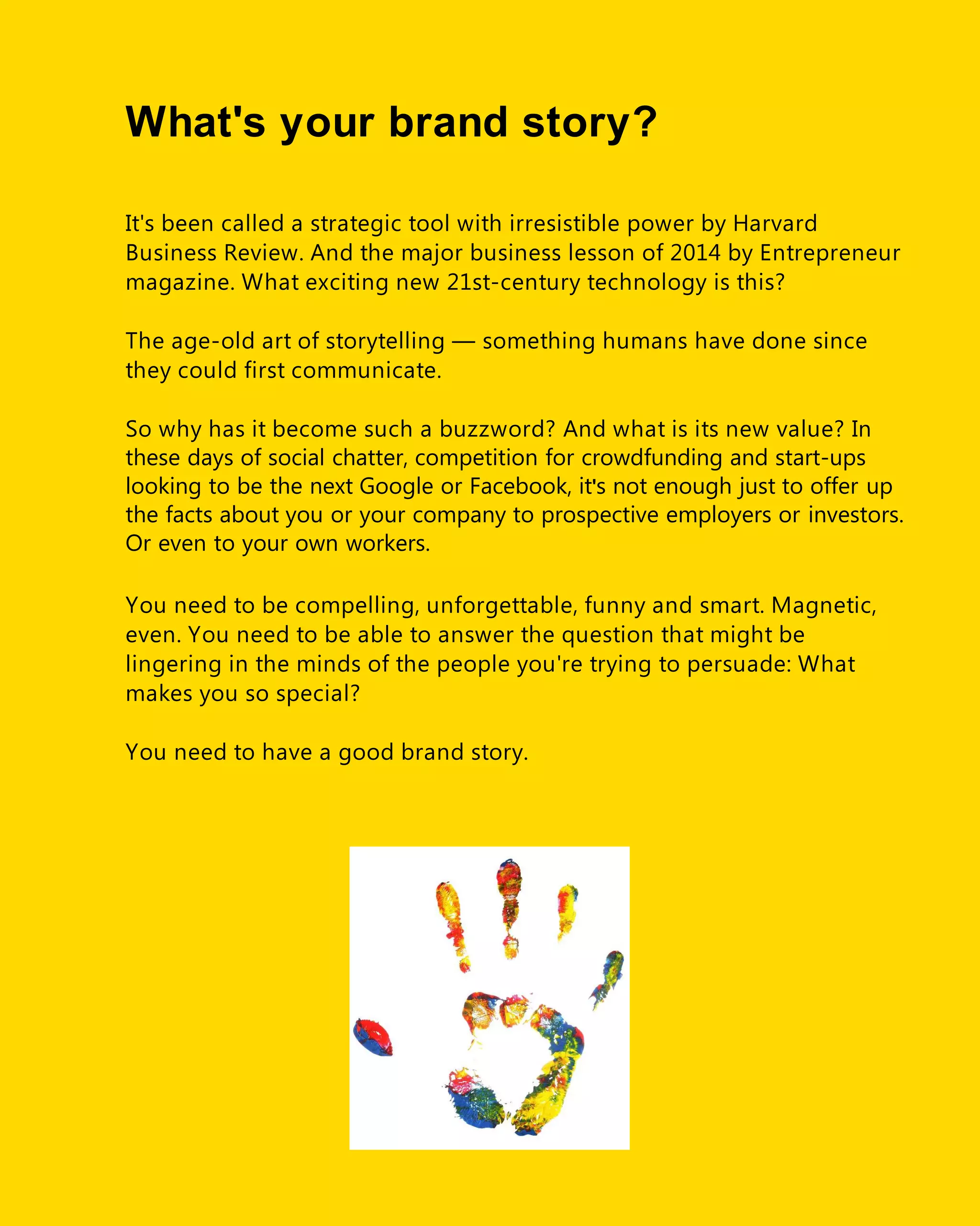 The document discusses the importance of developing a strong brand story. It states that in today's competitive environment, it is not enough to just provide facts about a company - you need to be compelling and memorable. A good brand story answers the question of what makes your brand so special. The document then provides guidance on key elements that make up a powerful brand such as defining a big idea that matters to people, reflecting customers, engaging customers, and enabling customers to do more. It emphasizes that powerful brands are about people, not products, and reflect customers' aspirations.