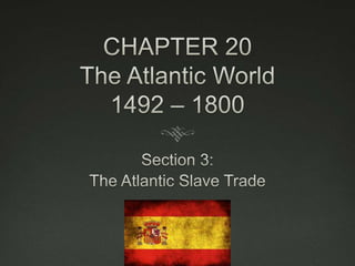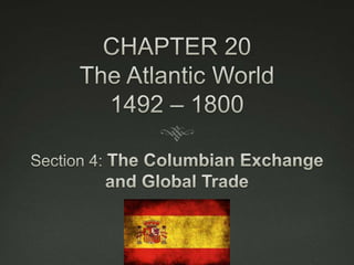 Christopher Columbus sailed to America in 1492 for Spain. He called the native people Indians and suggested that Spain could easily subjugate and enslave them with just 50 men. Spain's power expanded across Mexico and Peru through conquistadors like Hernan Cortes, who defeated the Aztec Empire in 1519. The Spanish established large farms that used native peoples as slave labor and intermarried with them. European colonization of the Americas led to the widespread transatlantic slave trade that brought over 9.5 million Africans to the region as slaves between 1500-1870. The forced migration of Africans and global exchange of goods, plants, and animals transformed societies around the world in what became known as the Columbian