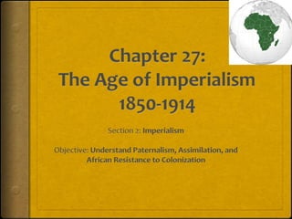 This document discusses European imperialism in Africa before 1914. It provides four reasons for European imperialism: colonies provided resources and markets, more colonies meant more power, social Darwinism and belief in European racial superiority, and a desire to spread Christianity. By 1914, most of Africa was under European control, with only Ethiopia and Liberia independent. The document also discusses imperialism in Asia and the Pacific, with European powers invading and colonizing regions like Southeast Asia and the Pacific Islands in the late 1800s.