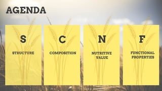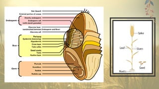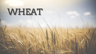 Wheat is a primary cereal crop in India, with significant production increases in states like Haryana, Punjab, and Uttar Pradesh. The grain has a complex structure composed of bran, endosperm, and germ, each serving specific nutritional functions, including providing high protein, carbohydrates, and essential vitamins. Its unique functional properties, like gluten formation and starch gelatinization, make wheat suitable for various culinary applications.