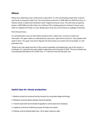 Wheat is the world's leading staple food crop and is grown widely across temperate regions. In Pakistan, it is the staple food and largest crop, contributing significantly to agriculture and GDP. The document provides details on wheat production in Pakistan, including recommended varieties for different zones, planting times, fertilizer and irrigation requirements, and pest and disease management. Key production tips emphasize proper variety selection, fertilizer and water management, and controlling weeds and diseases.