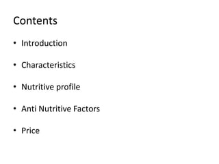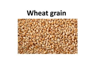 Wheat is a cereal grain that is cultivated worldwide and has several varieties grown in Pakistan. It is a Rabi crop sown in fall and harvested in spring. Wheat grain is highly nutritious, providing energy and protein while also being a staple food worldwide. It has a nutritive profile including protein, fiber, and minerals. However, it also contains anti-nutritional factors like phytic acid and trypsin inhibitors that can reduce mineral absorption and protein digestibility. Wheat currently sells for around 1300 rupees per 40 kg maund in Pakistan.