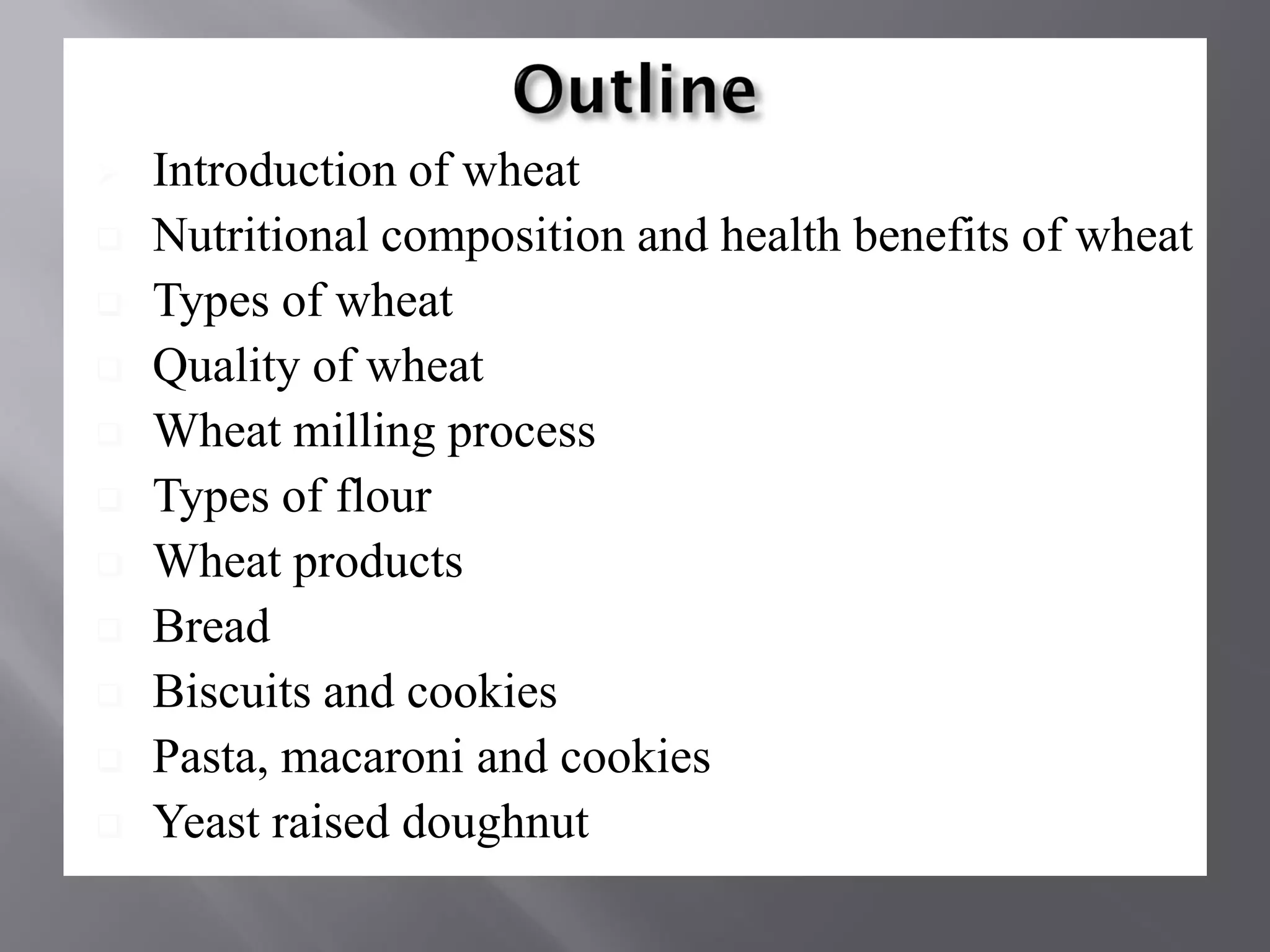 The document discusses the importance of wheat as a staple food crop, detailing its nutritional composition, health benefits, types, quality, and milling processes. It highlights wheat's role in various products such as bread, pasta, and baked goods while emphasizing the significance of dietary fiber and protein found in wheat. The document also covers the classification of wheat varieties, their uses in baking, and the factors affecting flour quality.