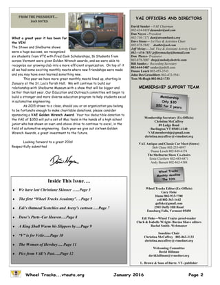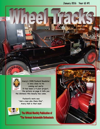 Avery Hall's 1928 Packard Roadster restoration, a four-year project, is nearing completion, showcasing a significant transformation. The Vermont Automobile Enthusiasts (VAE) reflect on a successful year with growing membership and impactful educational programs, including the Golden Wrench awards for high school students pursuing automotive engineering. The publication also pays tribute to the late Christiane Skinner, a long-time contributor and influential member, while highlighting upcoming events and community engagement in 2016.