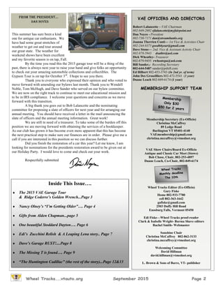 Bill Fagan is now the owner of a 1910 Stoddard Dayton, recently rescued from a mine. The Vermont Automobile Enthusiasts (VAE) have had a successful summer with events like the garage tour, and there's a call for nominations for the President's Restoration Award. The document also discusses organizational updates, including the need for a new treasurer and ongoing improvements to their bylaws.