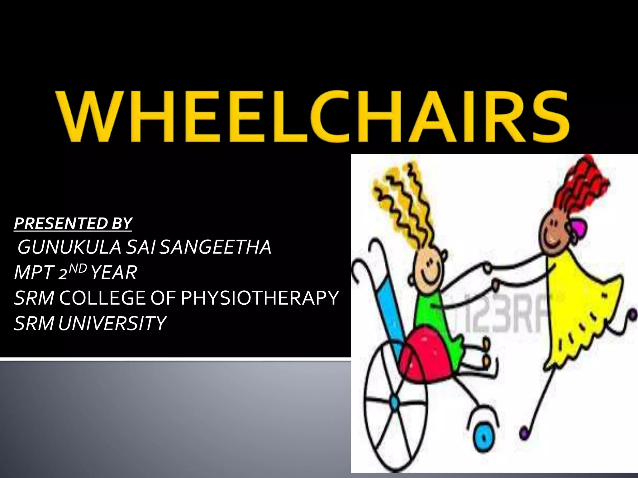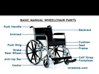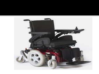 The document discusses the importance of wheelchairs as mobility aids for individuals with disabilities, emphasizing proper prescription and fit for maximizing functional mobility. It details various factors influencing wheelchair selection, including user needs, environmental considerations, and specific features for comfort and utility. Additionally, it highlights the importance of training in wheelchair use and management for optimized independence and safety.