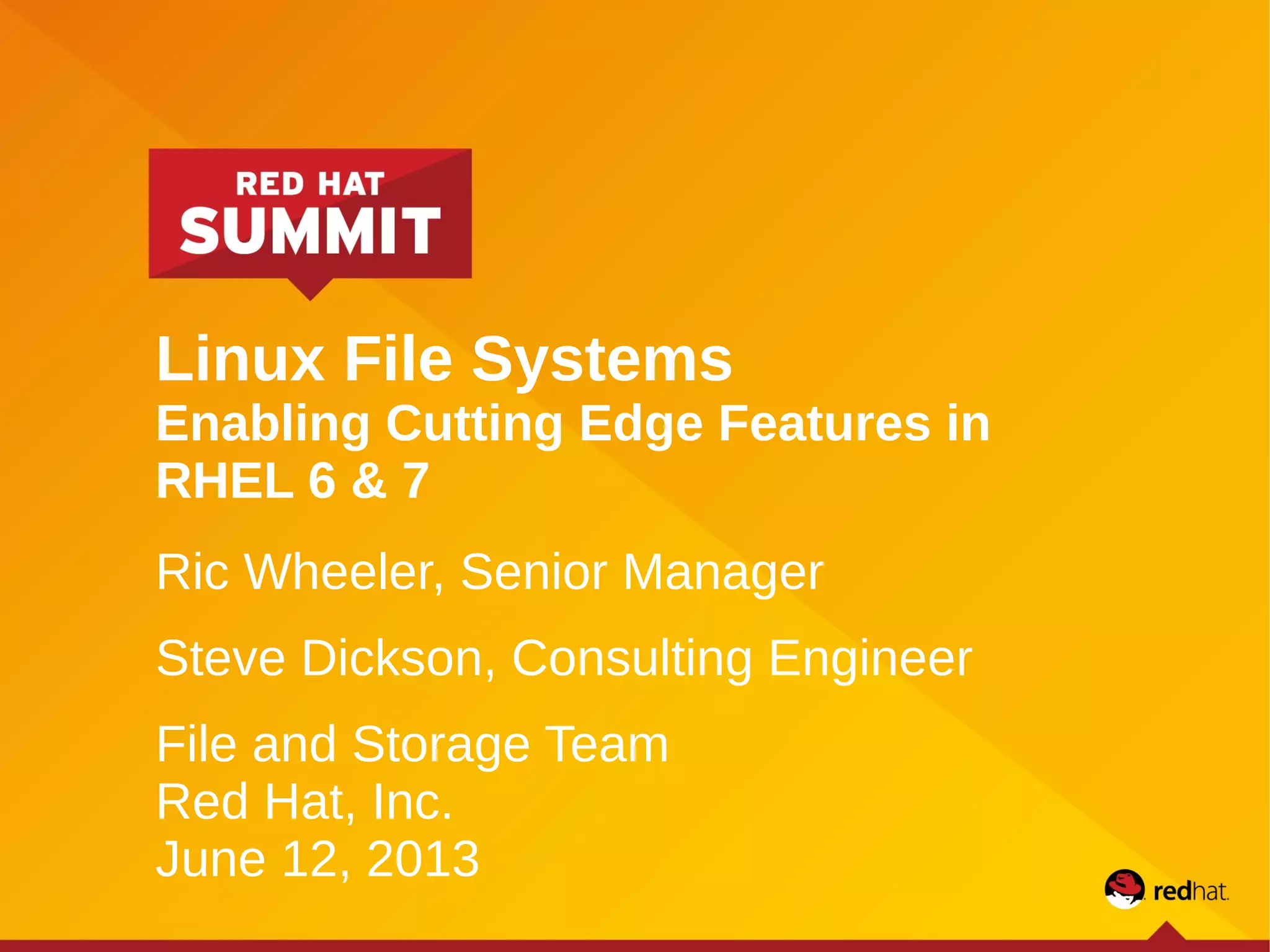 - RHEL7 is focusing on enhancing performance for high-speed devices like SSDs and new types of persistent memory. It will include block layer caching options and improved thin provisioning alerts. Btrfs support is also being expanded.