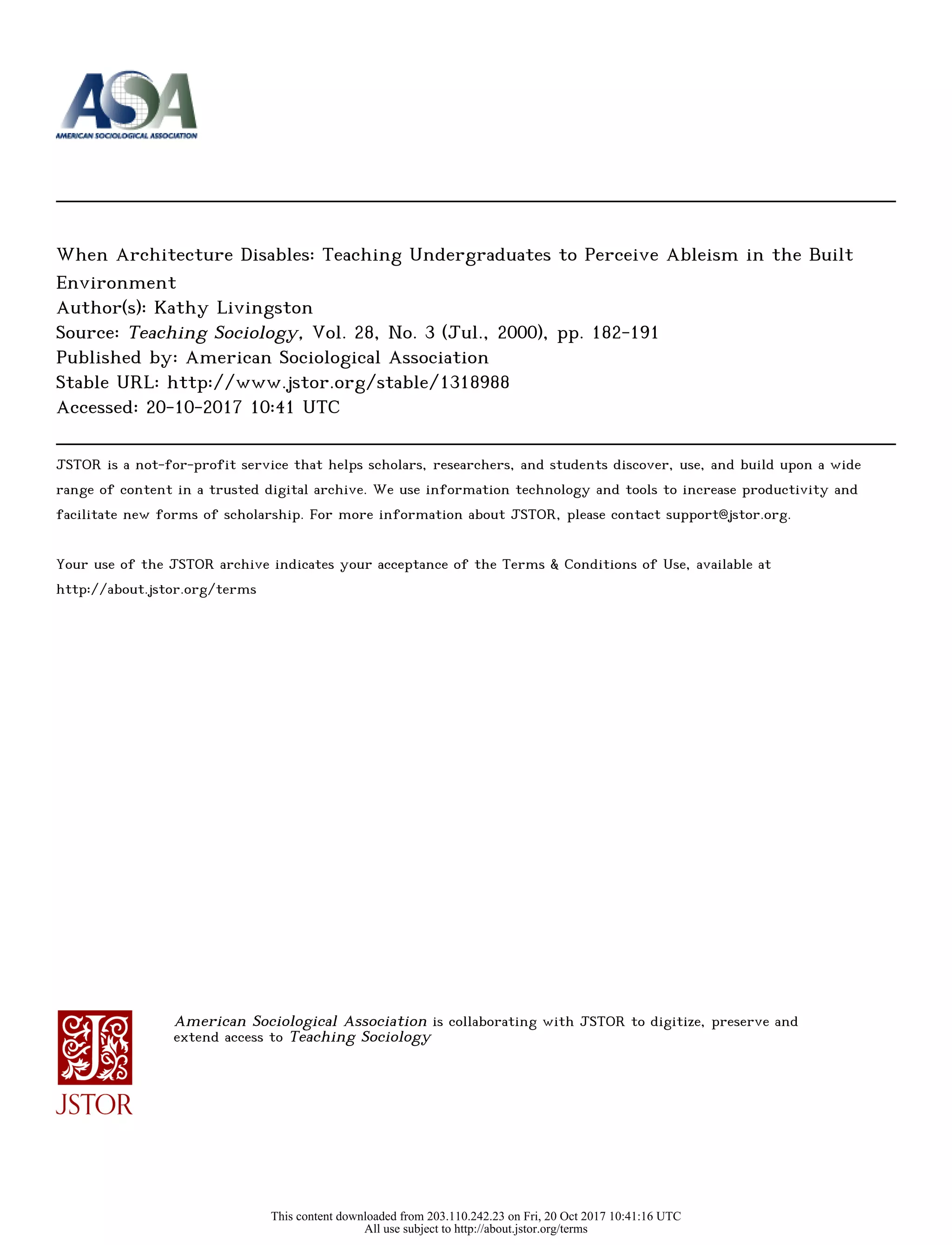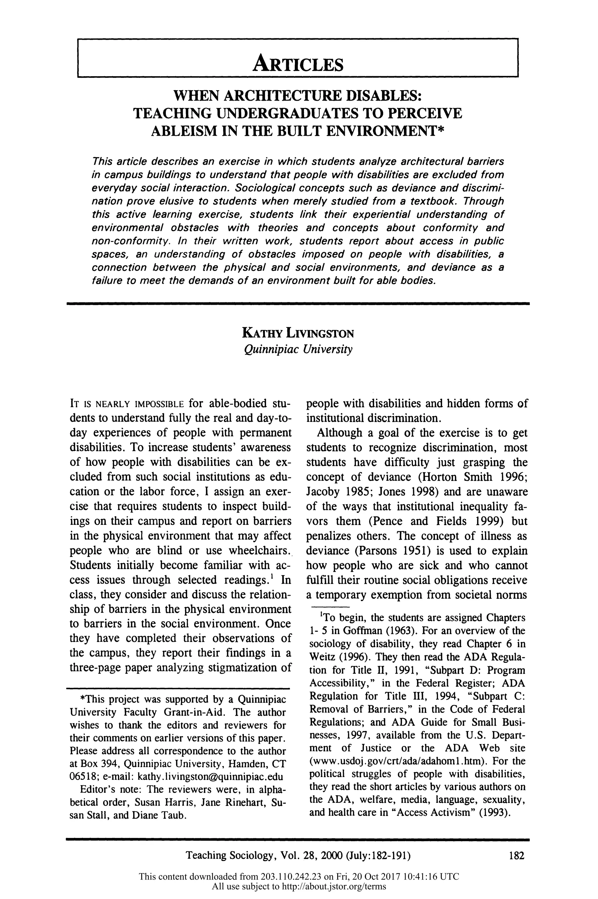 This document describes an exercise used to teach undergraduate students about ableism and discrimination against people with disabilities. In the exercise, students analyze architectural barriers in campus buildings to understand how people with disabilities are excluded from everyday social interaction. By observing barriers firsthand, students link their experiences to sociological concepts of deviance, conformity, discrimination, and stigma. In their written work, students demonstrate an understanding of how physical barriers relate to social barriers and how the built environment can disadvantage those with disabilities through institutional discrimination despite laws like the ADA. The goal is for students to recognize discrimination beyond overt individual acts and to perceive more subtle institutional ableism.