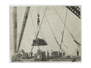 The document discusses the construction of the Empire State Building in 1930. It references the lack of safety equipment and protocols during construction, with workers using impact wrenches without hearing protection, standing on loose scaffolding boards, and questioning what would happen if a tool slipped and hit them before hitting the ground. It also mentions admiring the low profile tires on a truck and joking about safety equipment on machine guns.
