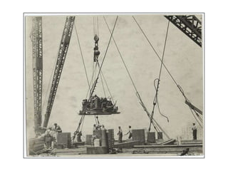 The document describes the construction of the Empire State Building in 1930. It mentions that modern safety equipment like fall protection would not be invented until later in the 1990s. It provides snippets of conversation between workers demonstrating the lack of safety practices and equipment during construction, such as standing on loose scaffolding boards and not wearing protective gloves.