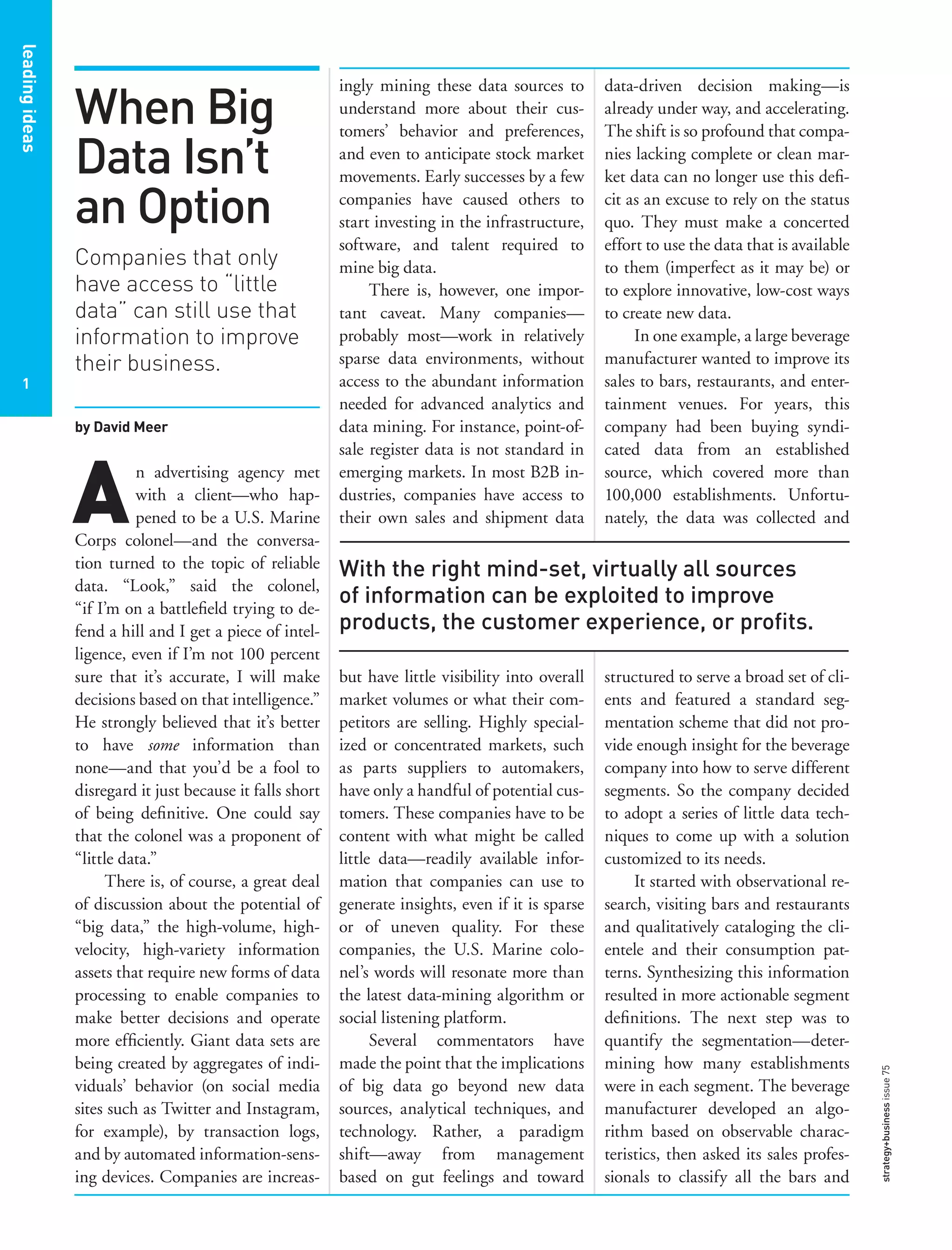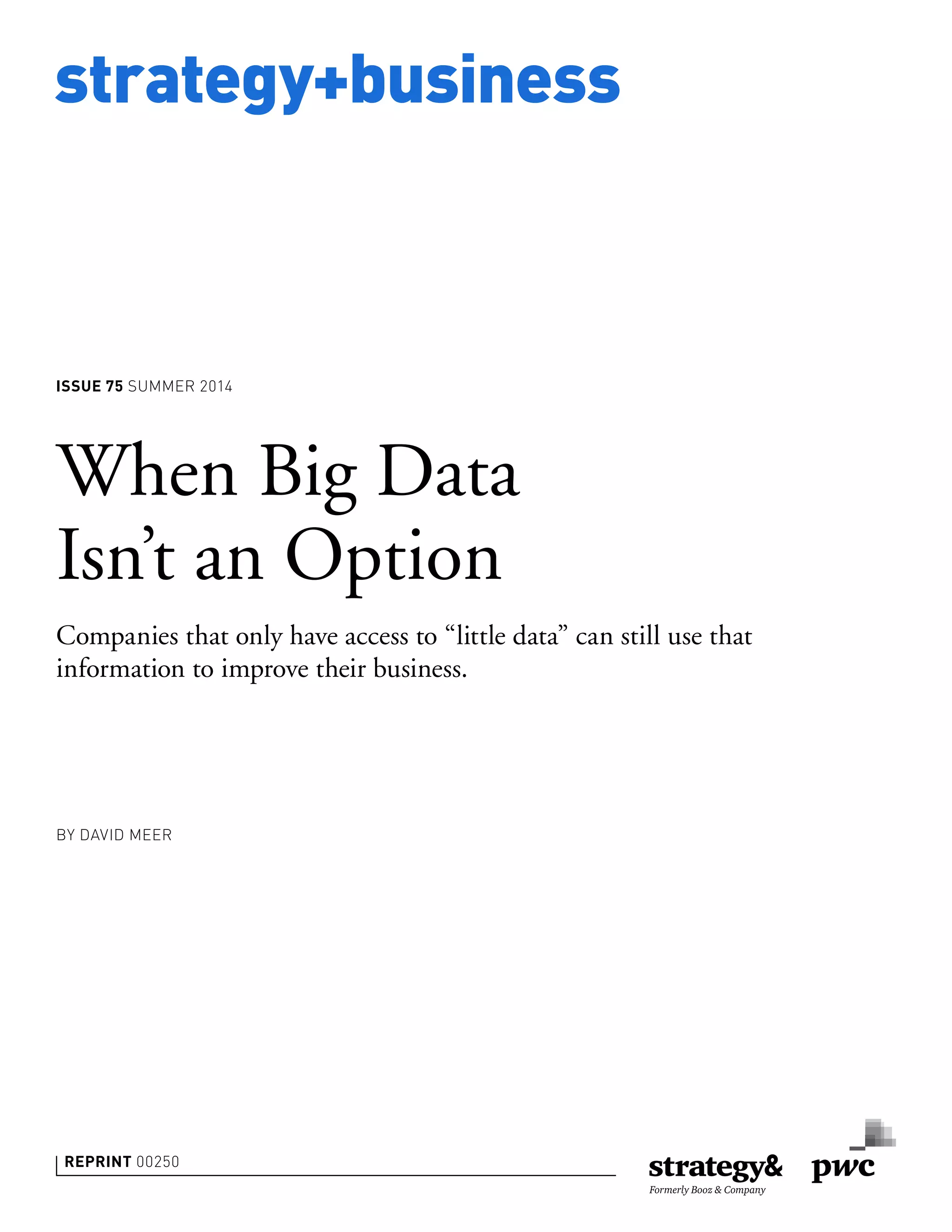 The document discusses how companies can leverage 'little data'—imperfect and limited data— to enhance decision-making and improve business operations, especially when access to big data is not feasible. Examples illustrate that companies can gain valuable insights through observational research, internal classification methods, and creative data mining techniques, which can lead to significant improvements in sales and customer experience. A commitment to data-driven decision-making, a willingness to experiment, and creativity are essential for companies looking to maximize the potential of little data.