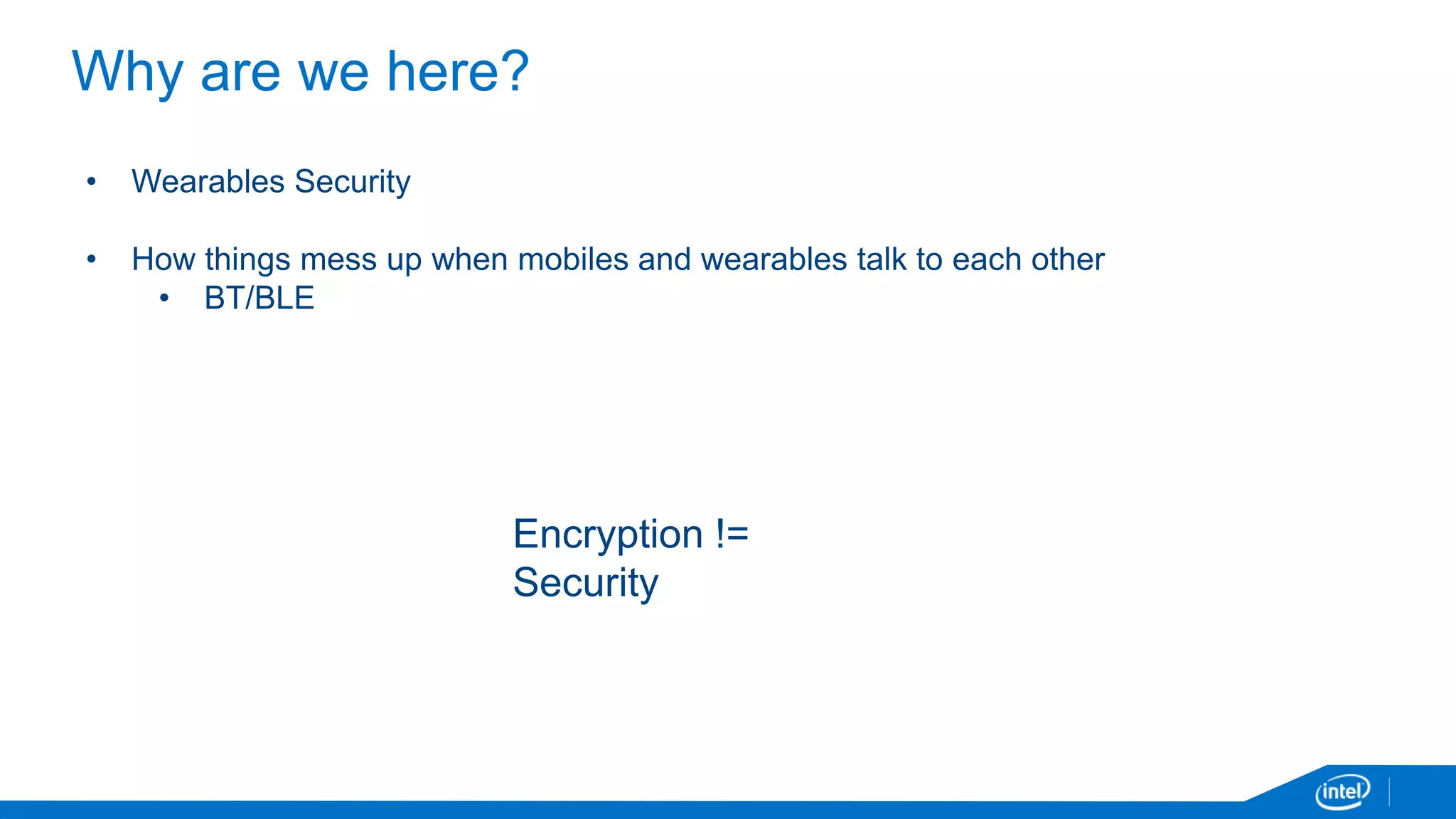 The document discusses the security vulnerabilities associated with mobile communication between wearables and devices using Bluetooth Low Energy (BLE). It highlights how encryption alone is insufficient for security, emphasizing various attack vectors such as man-in-the-middle and eavesdropping during the pairing process. The authors propose design and mitigation strategies to improve security and protect sensitive user data within the wearable and mobile application ecosystem.