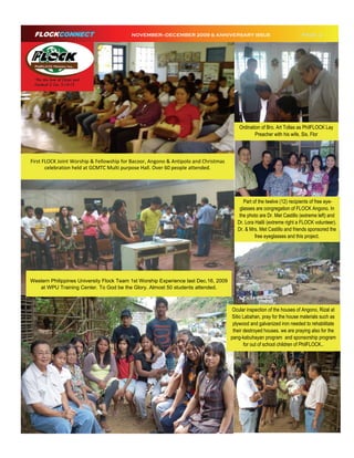 The document is the November-December 2009 anniversary issue of Flock Ministries International, celebrating 21 years of God's faithfulness and highlighting global outreach, community support, and church activities. It features various ministry initiatives such as church planting, health missions, and family camps, along with personal testimonies and contributions to community needs. The newsletter emphasizes the importance of continued ministry work and offers avenues for support and involvement in the organization's mission.