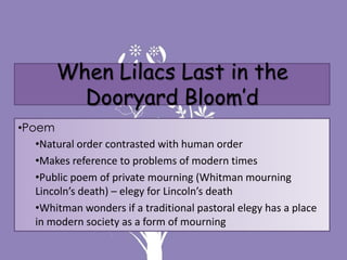 When Lilacs Last in the Dooryard Bloom'd is a pastoral elegy poem by Walt Whitman mourning the death of Abraham Lincoln. It uses nature imagery and symbols of a funeral procession to meditate on death and acceptance. The poem follows three simultaneous narratives - Lincoln's coffin journey, the poet's thoughts on death and mourning, and nature as separate yet sympathetic to humanity. The language shifts from formal rhetoric at the beginning to a more informal tone by the end.