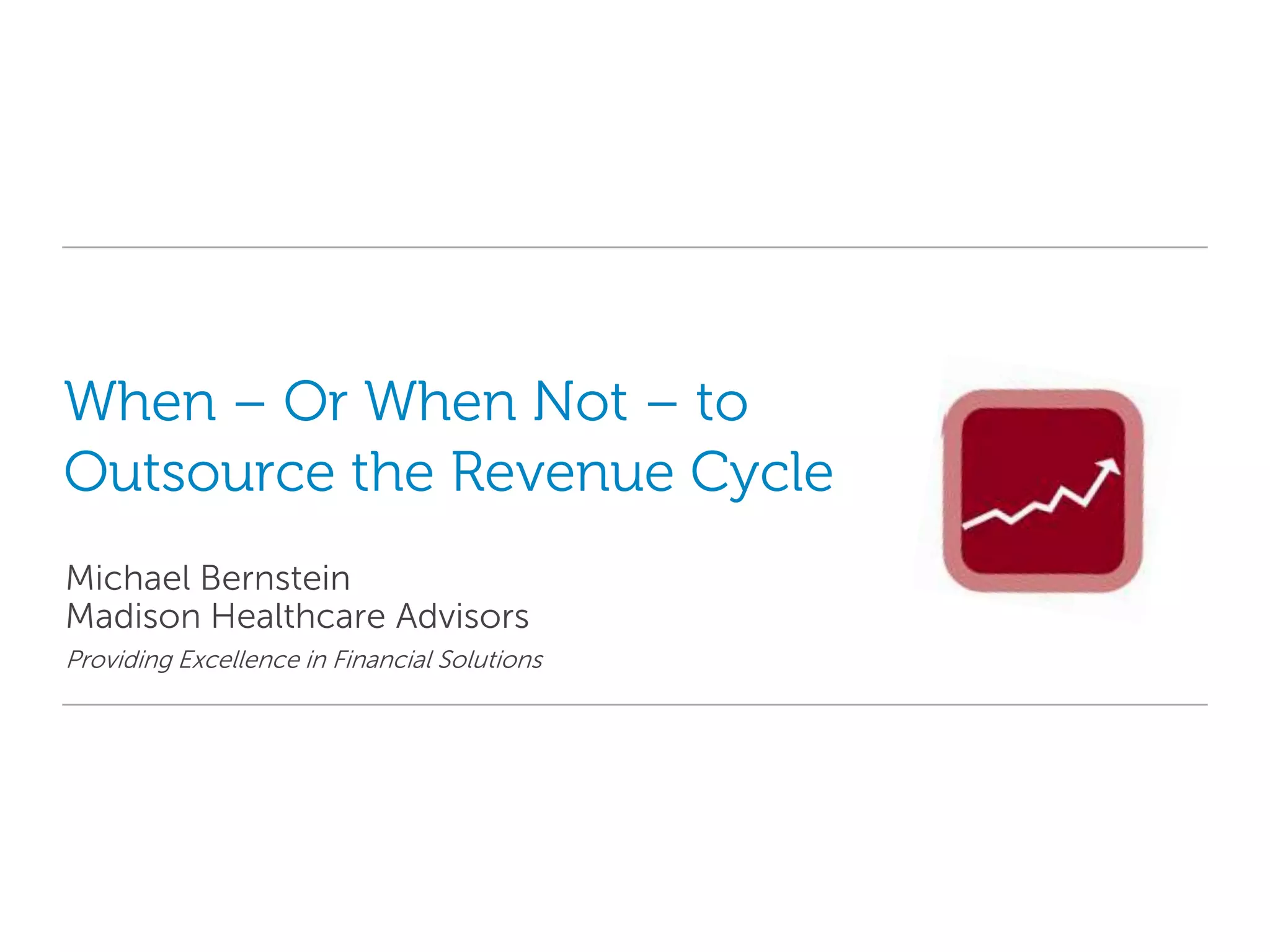 This document discusses when hospitals and physicians should consider outsourcing their revenue cycle management. It provides reasons why organizations outsource such as inability to attract qualified staff, high costs, and changing regulations. It addresses common myths around outsourcing and provides examples of outsourcing solutions. The document outlines an evaluation process for selecting a partner and discusses important considerations for the contract including performance indicators and incentives. Overall it aims to provide guidance on the revenue cycle outsourcing decision-making process.
