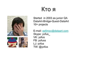Документ обсуждает факторы, влияющие на качество работы QA-команды, такие как сложные окружения, неясные требования и демотивация сотрудников. Упоминаются методы, которые могут помочь улучшить процесс тестирования и повысить удовлетворенность команды. Также документ предлагает идеи для самопроверки и поддержки эмоционального состояния QA-специалистов.