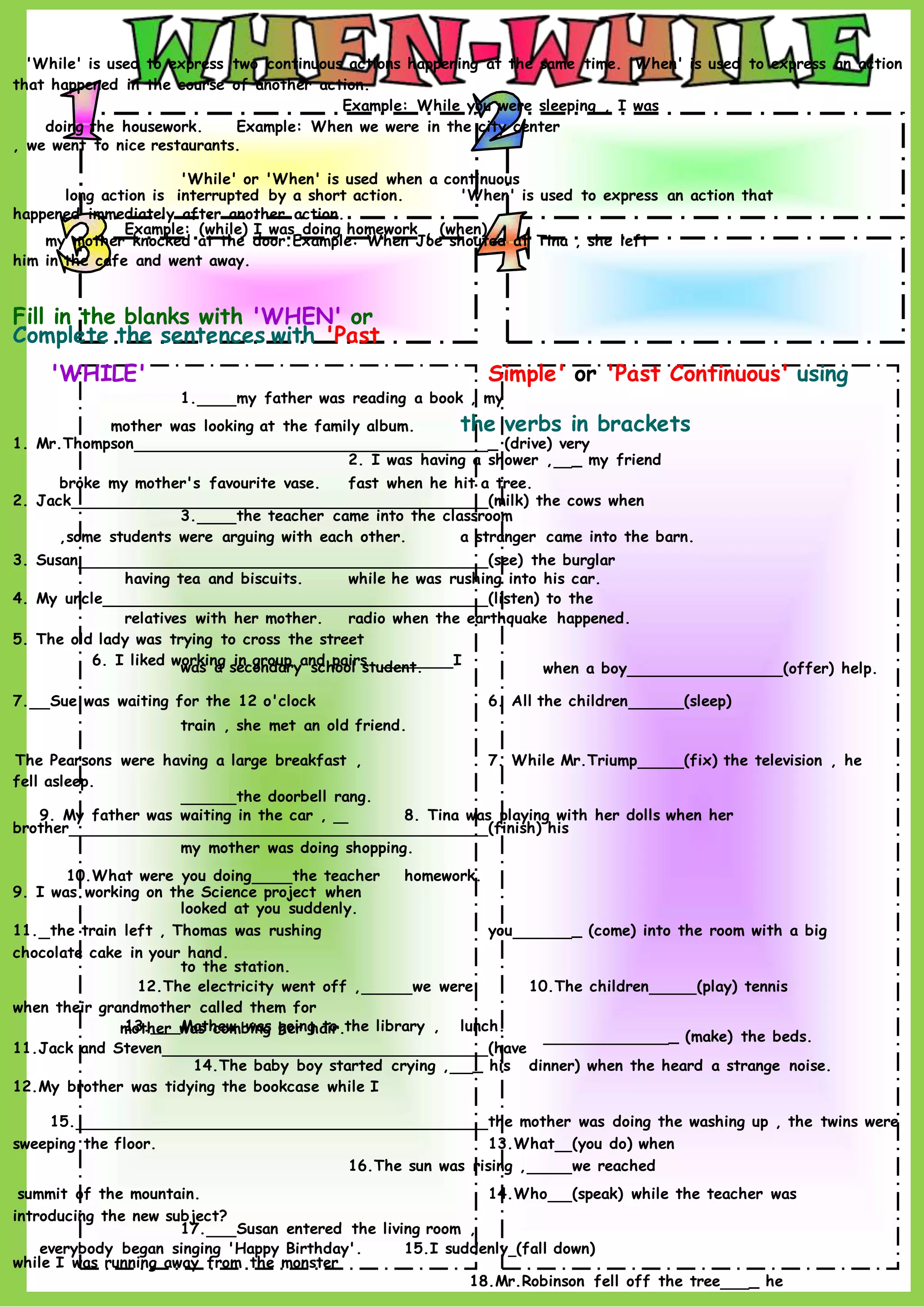 This document provides examples of using "while" and "when" to describe actions happening simultaneously or sequentially. "While" is used to express two continuous actions overlapping in time, like "While you were sleeping, I was doing housework." "When" can be used to connect an action that occurred during or immediately after another action, like "When we were in the city center, we went to restaurants" or "When Joe shouted at Tina, she left him." The document also contains a grammar exercise filling in blanks with "when" or "while" and changing verbs to past tense.