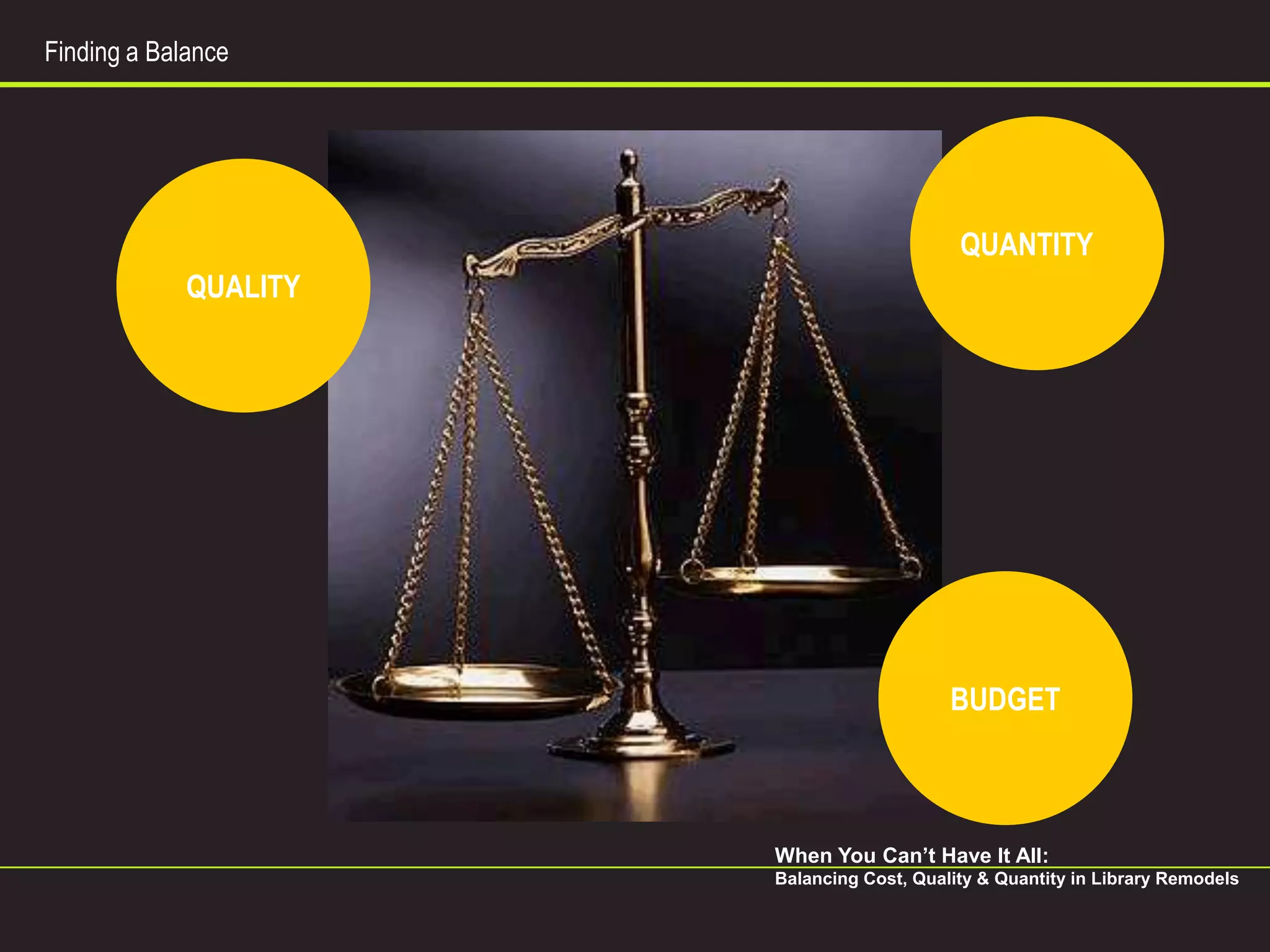 The document outlines the essential steps for balancing cost, quality, and quantity in library remodels, emphasizing the development of a comprehensive project plan and understanding the building's tangible and intangible factors. Key steps include identifying and prioritizing goals, managing costs, and creating a schedule while being prepared for inevitable changes. It highlights the importance of communication and collaboration among stakeholders to successfully navigate the complexities of renovation projects.