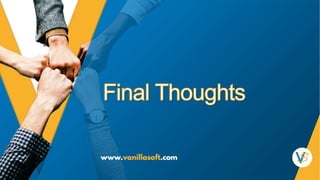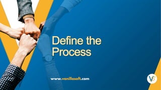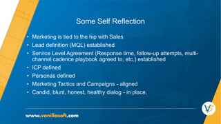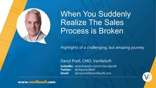 The sales process at VanillaSoft was broken, with missed targets, poor conversion rates, and difficulty hiring quality salespeople. An audit found issues with lead quality from marketing, sales staffing and training, and lack of a clearly defined sales process. Consultants were hired to audit the sales structure and performance, and make recommendations. Key changes included focusing on the ideal customer profile, revising sales roles and compensation, improving hiring and training, implementing a best-in-class sales methodology with clear stages and activity tracking, and providing sales reps the right technology stack. The recommendations aimed to get the sales process back on track and scaling properly.
