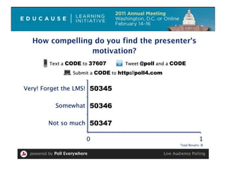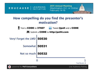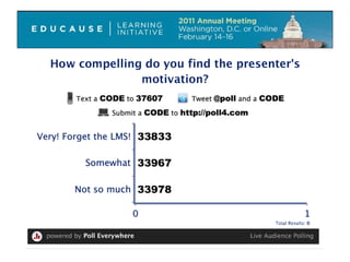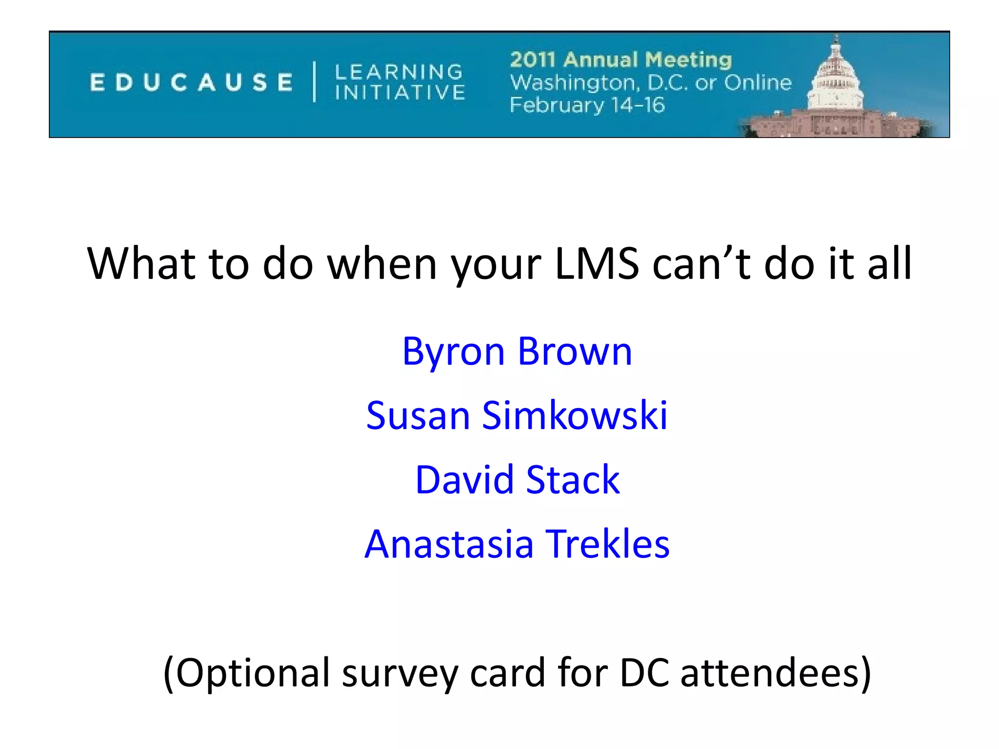 The document discusses the limitations of traditional Learning Management Systems (LMS) and explores alternative tools and methods to enhance student engagement and collaboration in educational settings. Presenters share their motivations for looking beyond LMS, highlight specific challenges, and recommend various technologies such as Wikispaces, Adobe Connect, and social media platforms for better instructional support. The presentation also addresses concerns regarding FERPA compliance, licensing, and support for non-LMS tools from a university IT perspective.