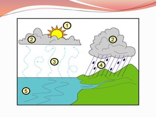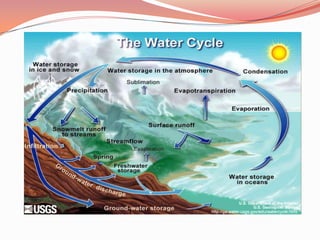 The document discusses the hydrosphere, which refers to the combined mass of water found on, under, and over the surface of a planet. It notes that the Earth's hydrosphere contains about 1.4 x 1018 tonnes of water, with about 75% of the Earth's surface covered by oceans. It also discusses Europa's thick hydrosphere which is thought to have an ocean up to 100 km deep under its icy surface. The hydrological cycle and water cycle are explained as the continuous movement of water between oceans, atmosphere, and land via evaporation, condensation, precipitation, and other processes. Water pollution and its causes are also summarized.