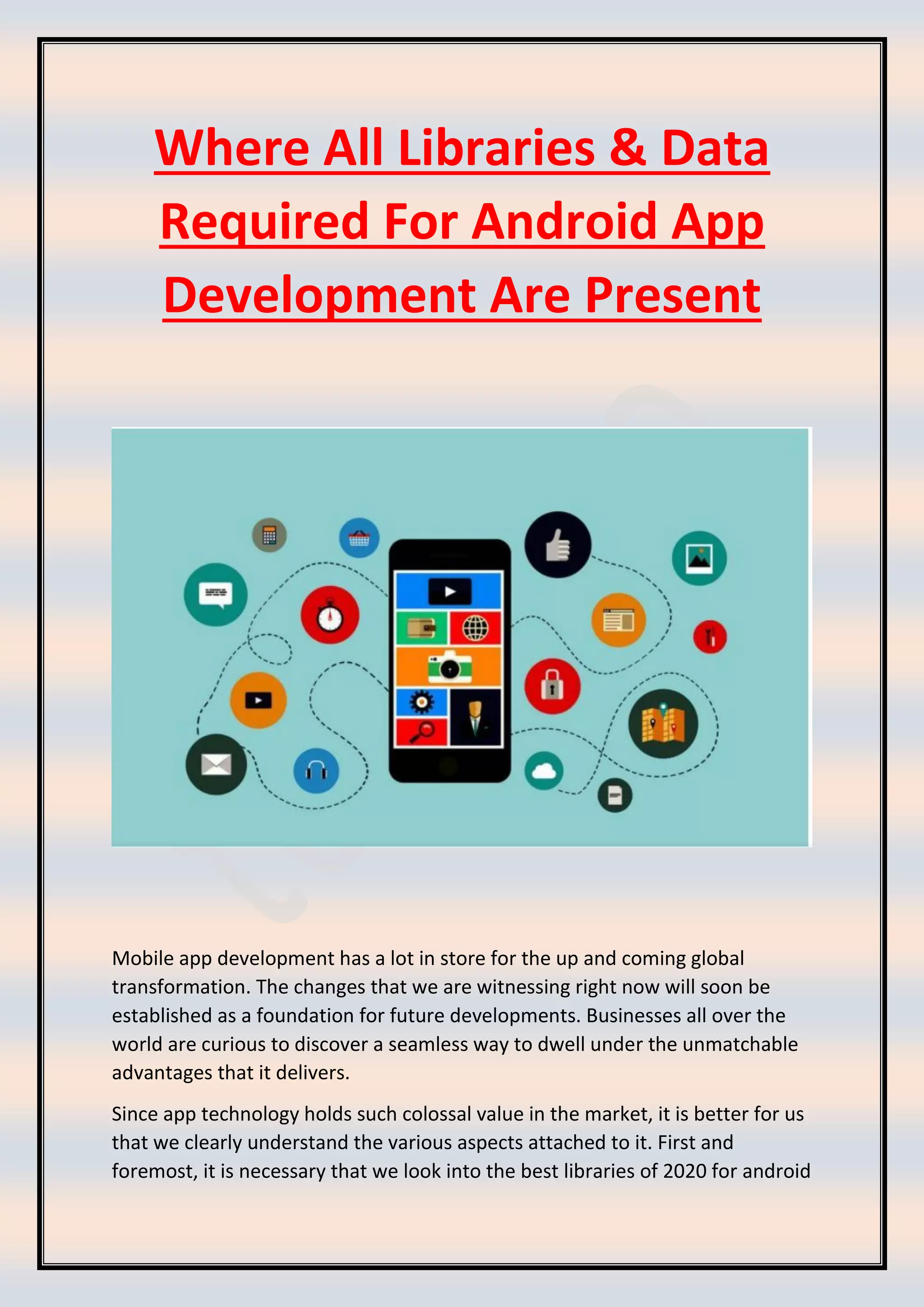 The document discusses essential libraries for Android app development, highlighting their importance for enhancing developer performance and user experience. It categorizes top libraries in 2023 for video playback, networking, testing, image loading, dependency injection, and view binding, while emphasizing the criteria for selecting the right libraries. Additionally, specific libraries like ExoPlayer, Retrofit, Picasso, Glide, and Dagger2 are mentioned for their unique capabilities in facilitating various development needs.