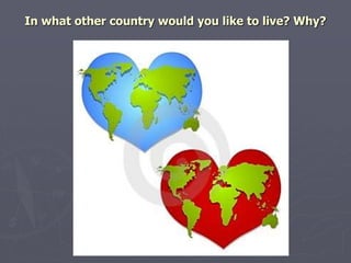 The document appears to be an English class worksheet that includes a variety of exercises and questions. It asks students about their country of origin, feelings in different situations, and knowledge of countries, flags, landmarks, seasons, weather, and verb conjugation. Multiple choice and fill-in-the-blank questions are included across different topics to practice English vocabulary, grammar, and comprehension.
