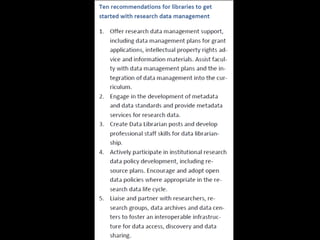 The document discusses the opportunities for libraries to support research data management from both researcher and policy perspectives. It highlights the importance of libraries in facilitating data sharing, improving data availability, findability, interpretability, and re-usability, while advocating for uniform data citation standards. Additionally, it presents ten recommendations for libraries to enhance their role in data management and encourages skill development and advocacy for data sharing among researchers.