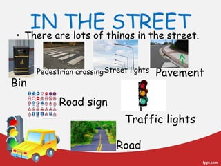 This document describes where the author lives and important places and safety rules. It mentions things found in the street like bins, signs and lights. It emphasizes using pedestrian crossings safely and waiting for the green light. It also lists various modes of transportation on land, water and air. Additionally, it notes the author lives in Spain which has 17 autonomous communities that are different from each other and lists some common places in a city like libraries, hospitals, museums and schools.