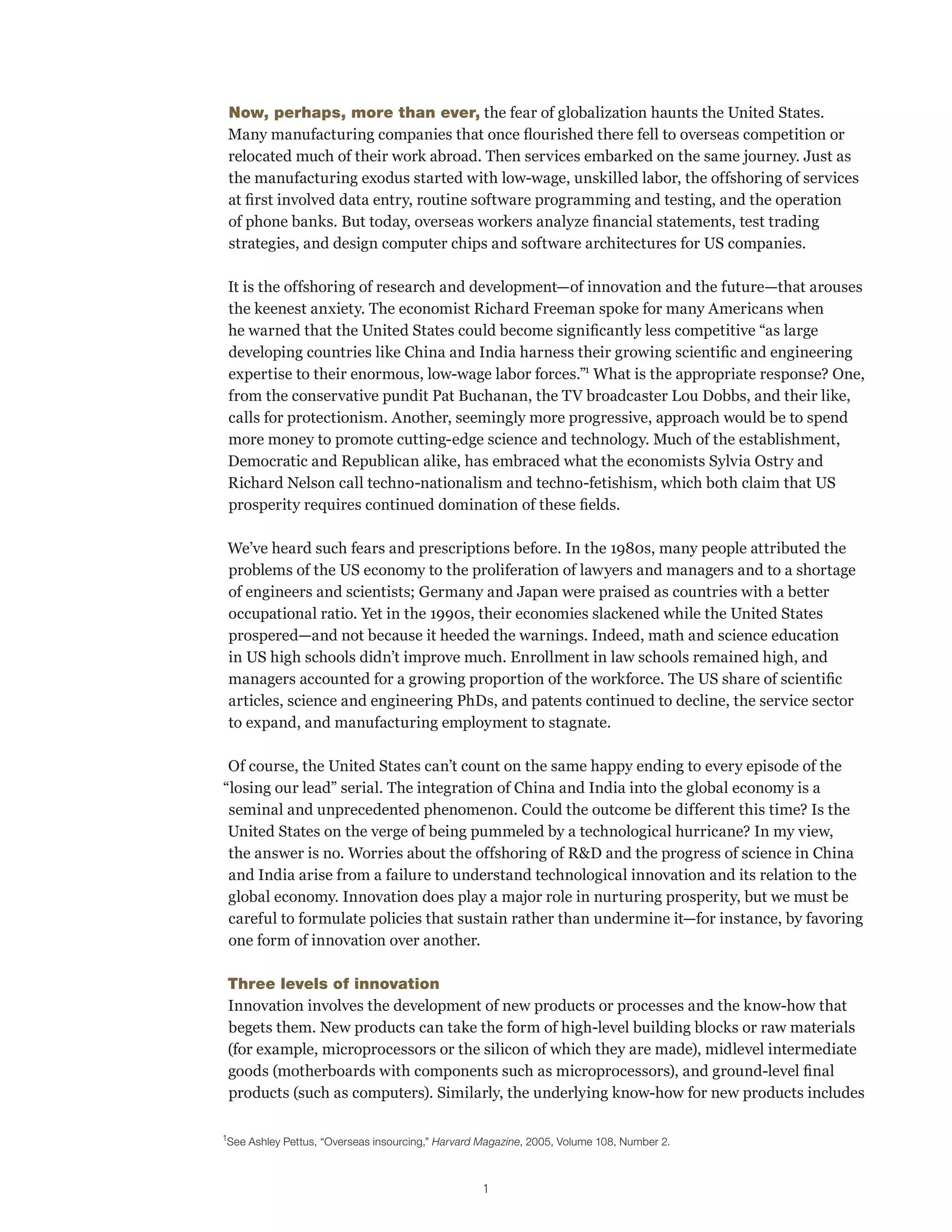 The document discusses three levels of innovation - high level (breakthrough discoveries), mid level (implementation of discoveries), and ground level (context-specific innovations to commercialize products). It argues that while high level innovations are important, sustained prosperity relies on innovations at all levels working together over many years in a complex system. As an example, it outlines the multi-decade process by which the transistor was developed from an initial discovery into a ubiquitous technology through innovations at multiple levels. It concludes that policies should focus on sustaining innovation broadly rather than favoring any particular level or form.