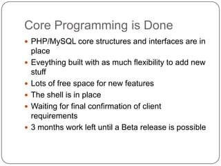 The document provides an update on the status and next steps for URANR.TV. It summarizes that core programming and a basic graphic interface are complete, but the client frontend still needs to be developed over the next 3 months. It details that no external access will be provided until the GAMMA conference in December 2010, where initial client training will occur. The beta version will then launch 13 weeks later in April 2011, followed by a 6 month testing period before the full 1.0 release. It stresses the importance of clients attending the GAMMA conference to secure gold client status and early adoption advantages.