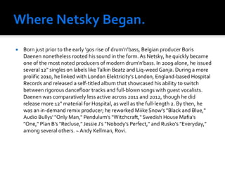 Netsky is a Belgian drum and bass producer who rose to prominence in the late 2000s. He released several singles on labels like Talkin Beatz and Liq-weed Ganja in 2009. In 2010, he signed with Hospital Records and released his self-titled debut album, showcasing his ability to produce dancefloor tracks as well as songs featuring vocalists. He became a sought-after remix producer, working on songs by Miike Snow, Swedish House Mafia, and others.