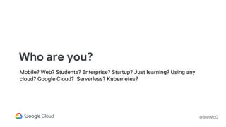 The document discusses various cloud computing options including serverless, containers, and virtual machines, highlighting Google's offerings such as Compute Engine, App Engine, Kubernetes Engine, and Cloud Functions. It emphasizes the importance of choosing the right infrastructure based on application needs, team structure, and scalability requirements. Additionally, the document provides insights into the distinctions between managing applications within virtual machines versus utilizing container orchestration with Kubernetes and serverless paradigms.