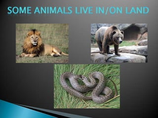 Animals live in a variety of homes including holes in the ground, caves, nests, trees, water, and some live in both land and water. Tigers and bears live in mountain caves while rabbits, ants and snakes live underground in burrow networks. Monkeys and chimpanzees live in trees, building nests from branches, and birds build nests from twigs and leaves to hold their eggs. Some animals only live in water while others live in both land and water environments.