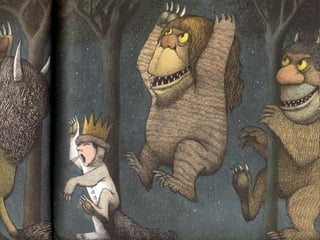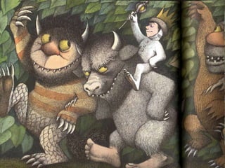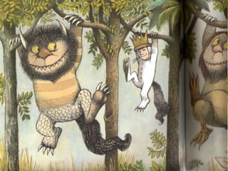 Max misbehaves and is sent to bed without supper. He imagines sailing away to a magical land where wild things live. The wild things are scary at first but Max tames them and becomes their king. However, Max gets lonely for his family and decides to return home, despite the wild things begging him to stay. When he returns, he finds his supper is still hot and waiting for him.