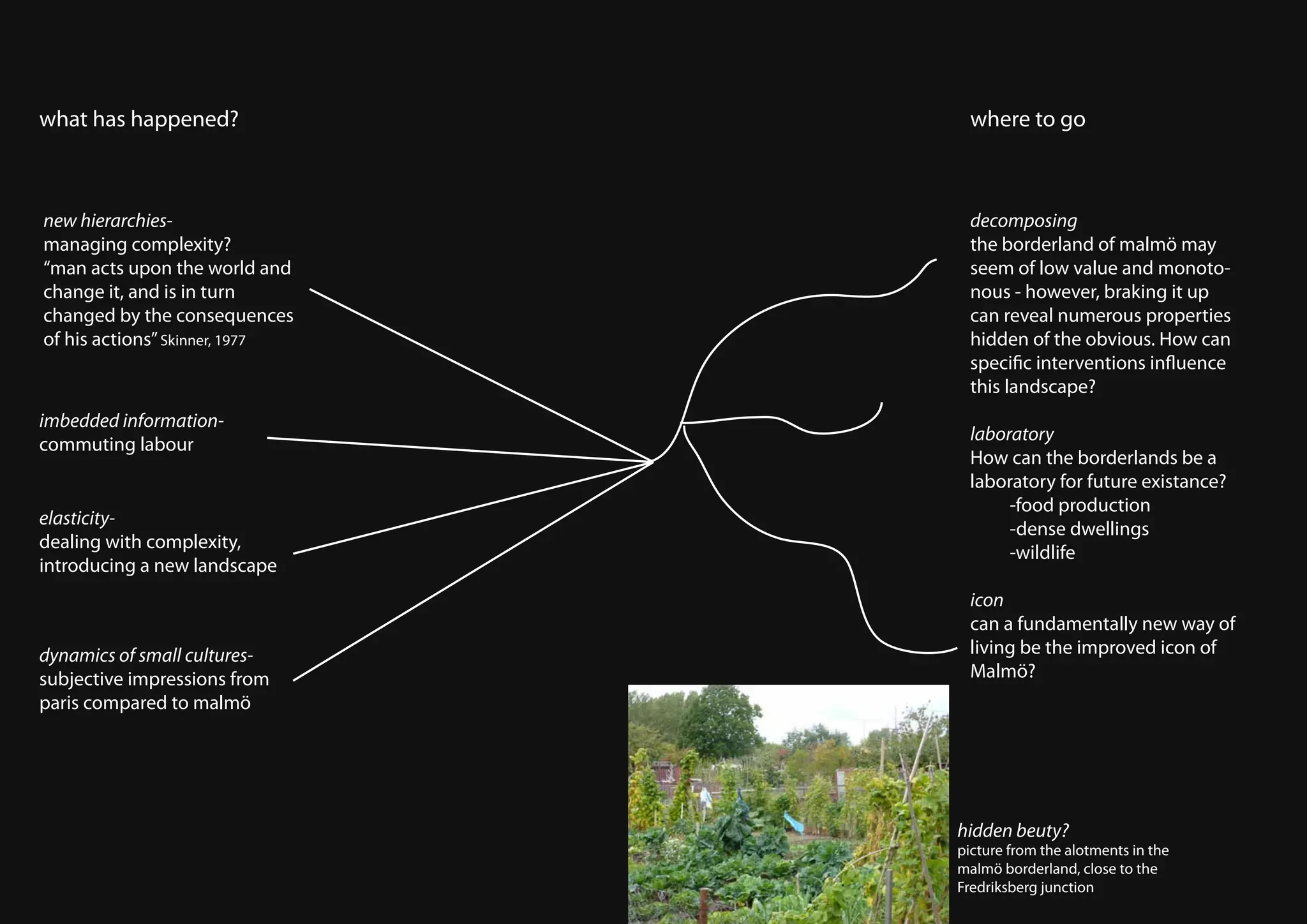 This document discusses managing complexity and change by breaking up landscapes like the borderlands of Malmö into smaller pieces to reveal hidden properties. It suggests using these borderlands as a laboratory to test interventions for food production, dense dwellings, and wildlife in creating a new landscape. It asks if a fundamentally new way of living could become an improved icon for Malmö by exploring the dynamics of small cultures through subjective impressions compared to larger cities like Paris.