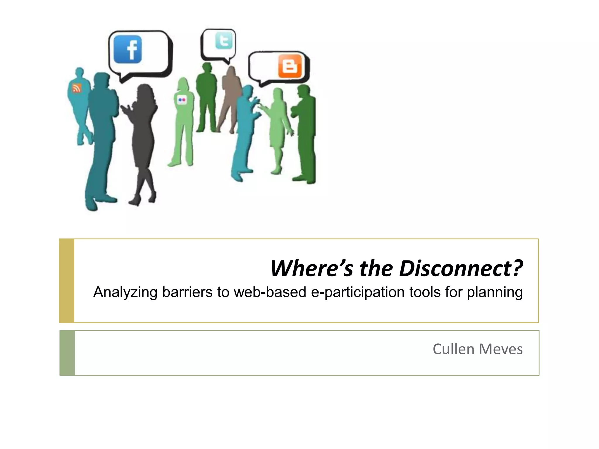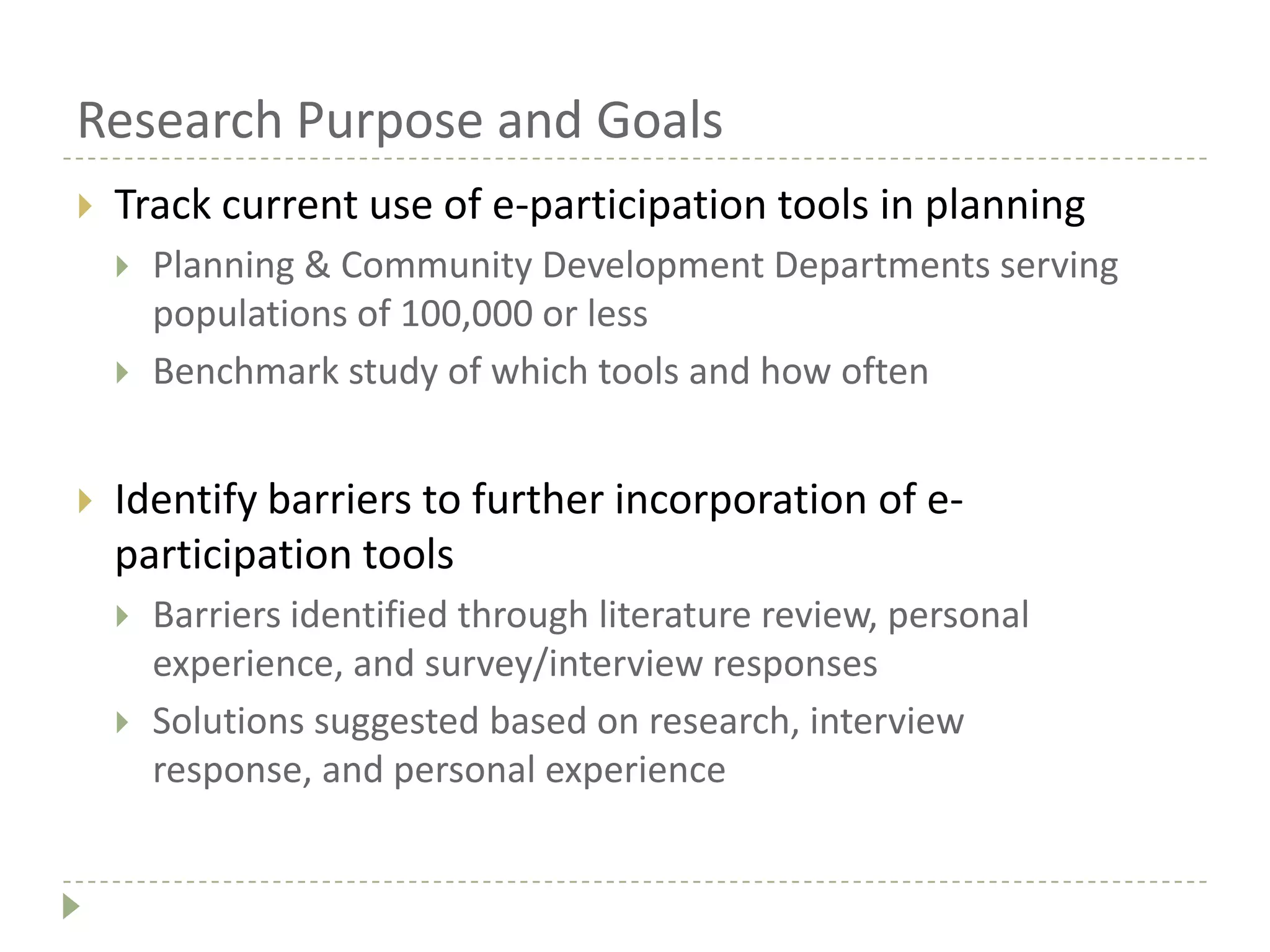 The document analyzes barriers to the adoption of web-based e-participation tools in planning departments serving smaller populations, identifying key issues such as limited budgets, staff time, and training. It includes a benchmarking study based on surveys of 349 respondents and interviews that reveal low usage rates of e-participation methods and the importance of public engagement. Overall, the study suggests that improvements in user experience could reduce some barriers and facilitate more effective public participation.