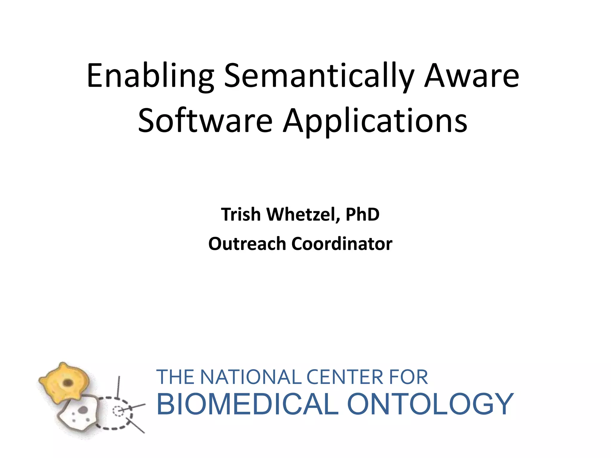 The National Center for Biomedical Ontology (NCBO) provides several software tools to enable semantically aware applications. These include BioPortal, an online library of biomedical ontologies, Ontology Widgets which allow integration of ontologies into websites, and the Annotator, a web service that semantically tags text with ontology terms. The NCBO also plans to develop a comprehensive index of online biomedical resources.