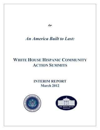 This document provides an interim report on the White House Hispanic Community Action Summits held in 2011-2012. It discusses the growth of the Hispanic population in the US and their importance to the economy and workforce. It describes the first White House Hispanic Policy Conference in 2011 and the subsequent regional summits that were held to engage Hispanic leaders and federal officials on key issues. Over 3000 leaders participated in discussions on jobs, education, healthcare, immigration and Hispanic heritage. The report outlines federal actions taken in response to issues raised at the summits.