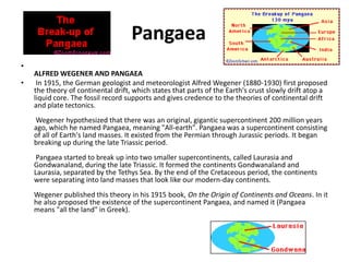Alfred Wegener first proposed the theory of continental drift in 1915, hypothesizing that 200 million years ago the continents were joined together in a supercontinent called Pangaea. Pangaea began breaking apart in the late Triassic period, forming the continents of Gondwanaland and Laurasia separated by the Tethys Sea. By the end of the Cretaceous period the continents had separated into their modern positions. Wegener published his theory of continental drift and the existence of Pangaea in his 1915 book.