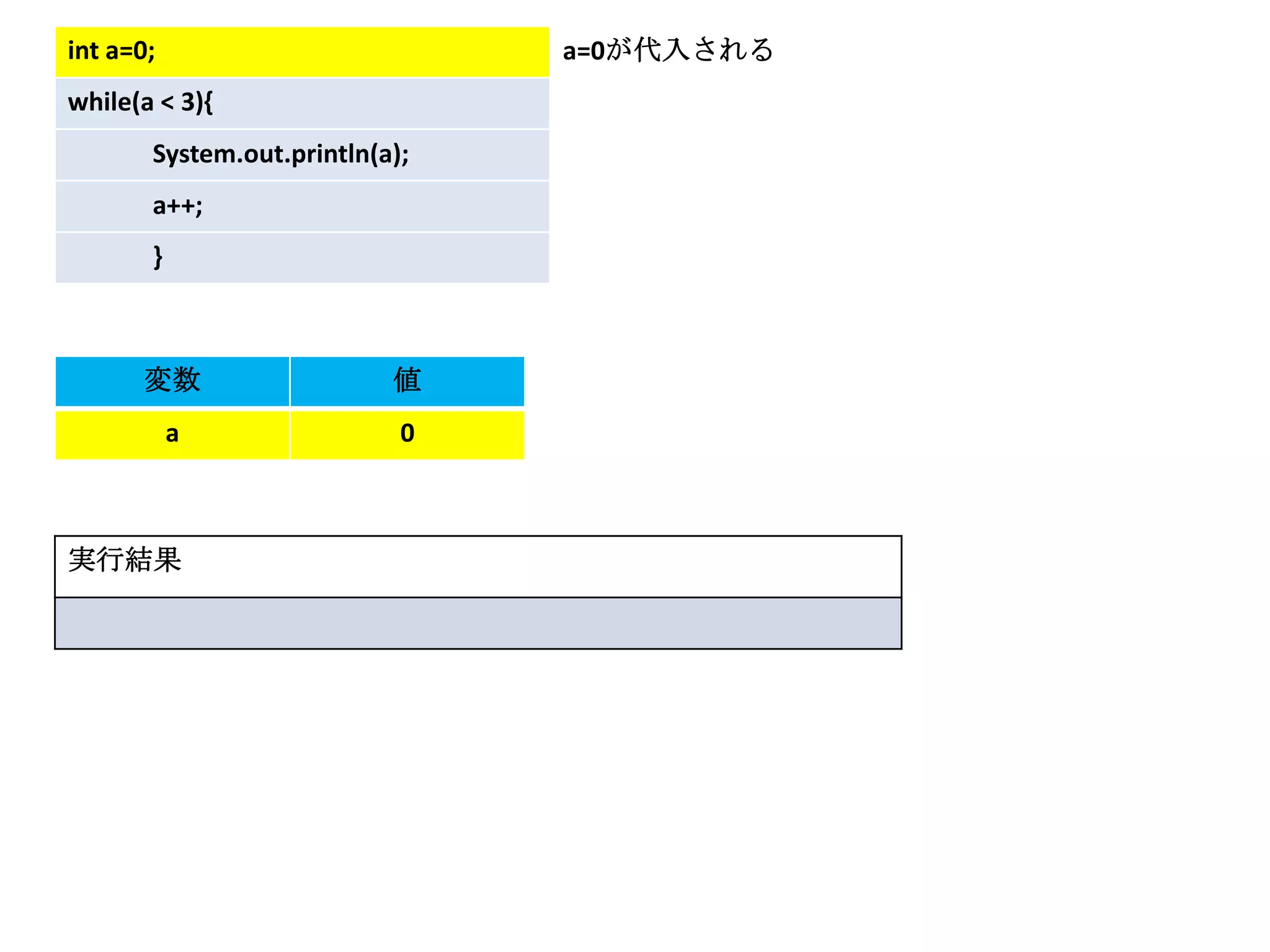 int a=0; 同じ処理をもう一度繰り返し,aが3になる