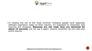 Recruiters typically spend only 15 seconds skimming each resume. To maximize the chances of your resume standing out, keep it to one page and use concise bullet points of no more than 1-2 lines each. Focus on your specific accomplishments rather than team accomplishments or generic job responsibilities. Highlighting 3-5 accomplishments per role through concrete examples will help recruiters quickly understand your qualifications and value. Following these tips can help ensure recruiters fully consider your candidacy in those critical first 15 seconds.