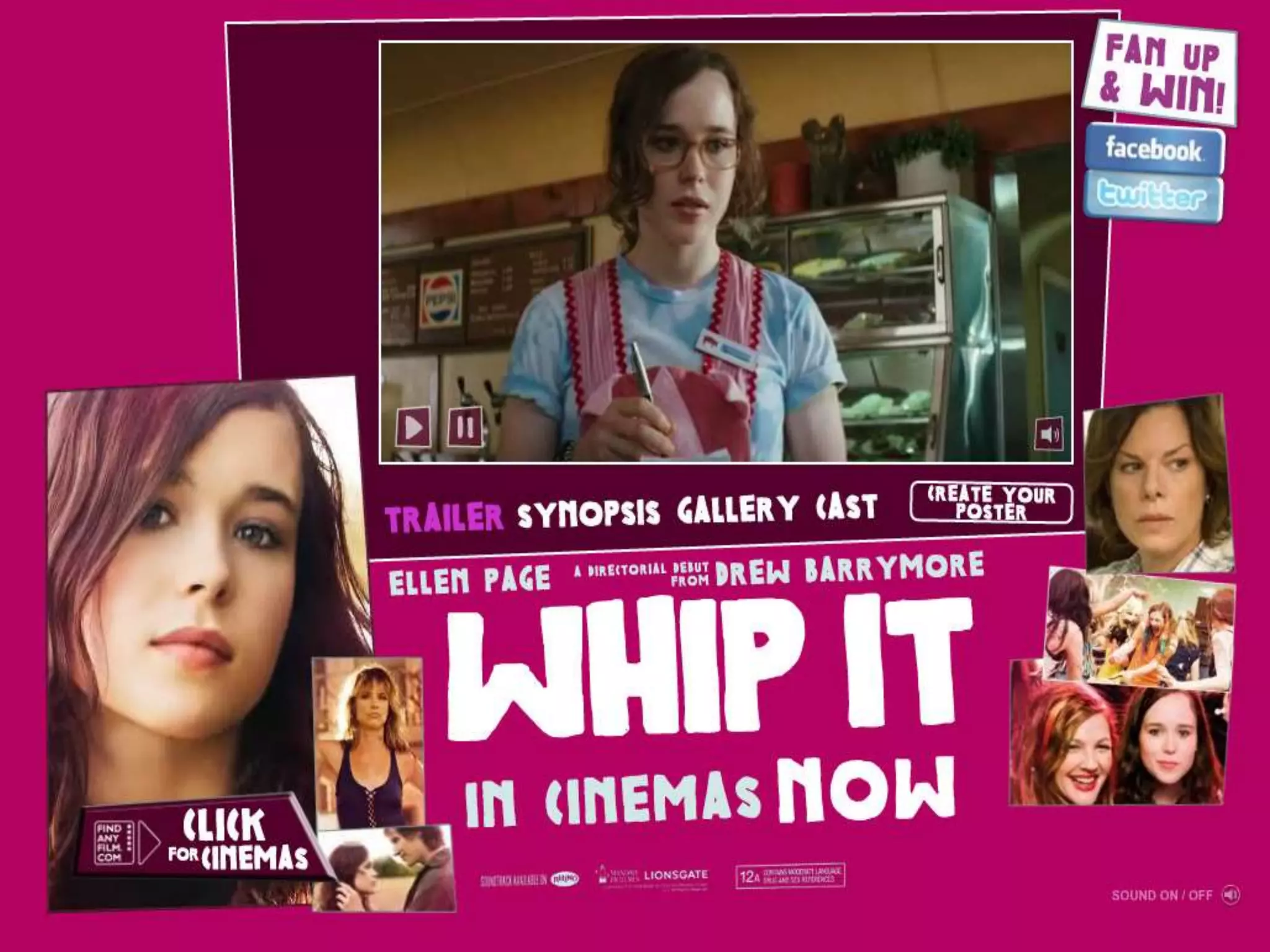 The website provides key information for viewers about an upcoming film, including when it will be released in cinemas near them, the trailer, cast, and gallery of pictures from the film. It also includes links to the film's social media pages and advertises the film soundtrack playing in the background to help promote the movie. The full trailer automatically plays on the front page of the site to attract viewers.
