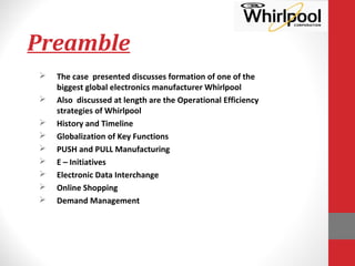 Whirlpool is a large global manufacturer and marketer of home appliances headquartered in Michigan. The document discusses Whirlpool's history and operations, including its transition from a push-based to pull-based manufacturing model in the 1990s to better match production to customer demand. It also covers Whirlpool's globalization of key functions like procurement and product development, as well as its use of demand planning tools and initiatives like EDI to increase supply chain efficiency. The summary provides an overview of Whirlpool's operations and strategies over time to improve responsiveness to customers.