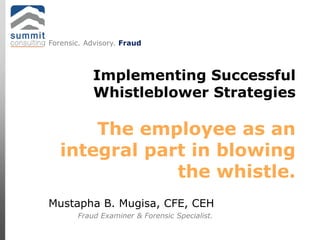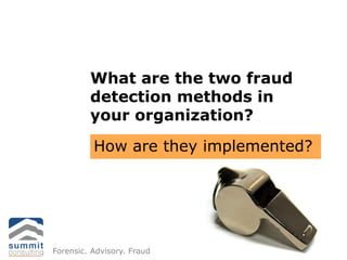 This document discusses whistleblower strategies and fraud detection methods. It recommends establishing secure whistleblower hotlines to detect fraud through anonymous tips in local languages. Effective hotlines are available 24/7 through multiple channels, ensure confidentiality and anonymity, and have response teams that thoroughly review and investigate all cases. The document promotes a customized online hotline called Scethicsline.com that supports these best practices for detecting fraud through whistleblower tips.