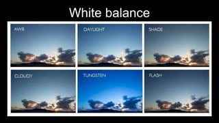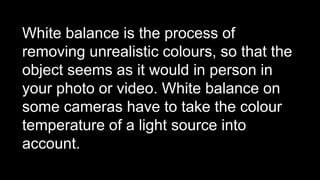 White balance is a process that removes unrealistic colors from photos and videos to accurately represent the color temperature of light sources. It helps produce high quality images under different lighting conditions by accounting for whether the light is daylight, tungsten, or set manually. There are typically four white balance options - automatic, daylight, tungsten, and custom - with custom allowing the user to manually set the white balance by pointing the camera at a white surface and pressing a set button.