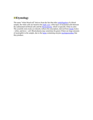 White blood cells, or leukocytes, are cells of the immune system that defend the body against infectious disease and foreign materials. There are five main types of leukocytes - granulocytes (neutrophils, basophils, eosinophils) and agranulocytes (lymphocytes, monocytes). Granulocytes contain granules that help them digest pathogens, while agranulocytes do not contain granules. Leukocytes are produced in the bone marrow and circulate throughout the body in blood and lymph fluid. An abnormal increase or decrease in the number of leukocytes can indicate certain diseases.